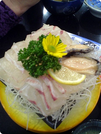 위에 신선한 회와 전복이 올려진 음식이 있었는데요.